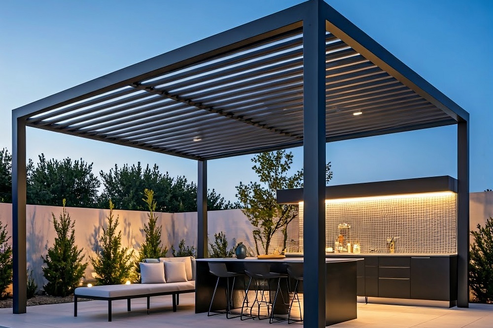 Motorised Louvre Pergola combines sleek modern design with durable construction and smart adjustable louvers. Effortlessly control sunlight and shade with a motorised system, enhancing your outdoor living experience in style and comfort.