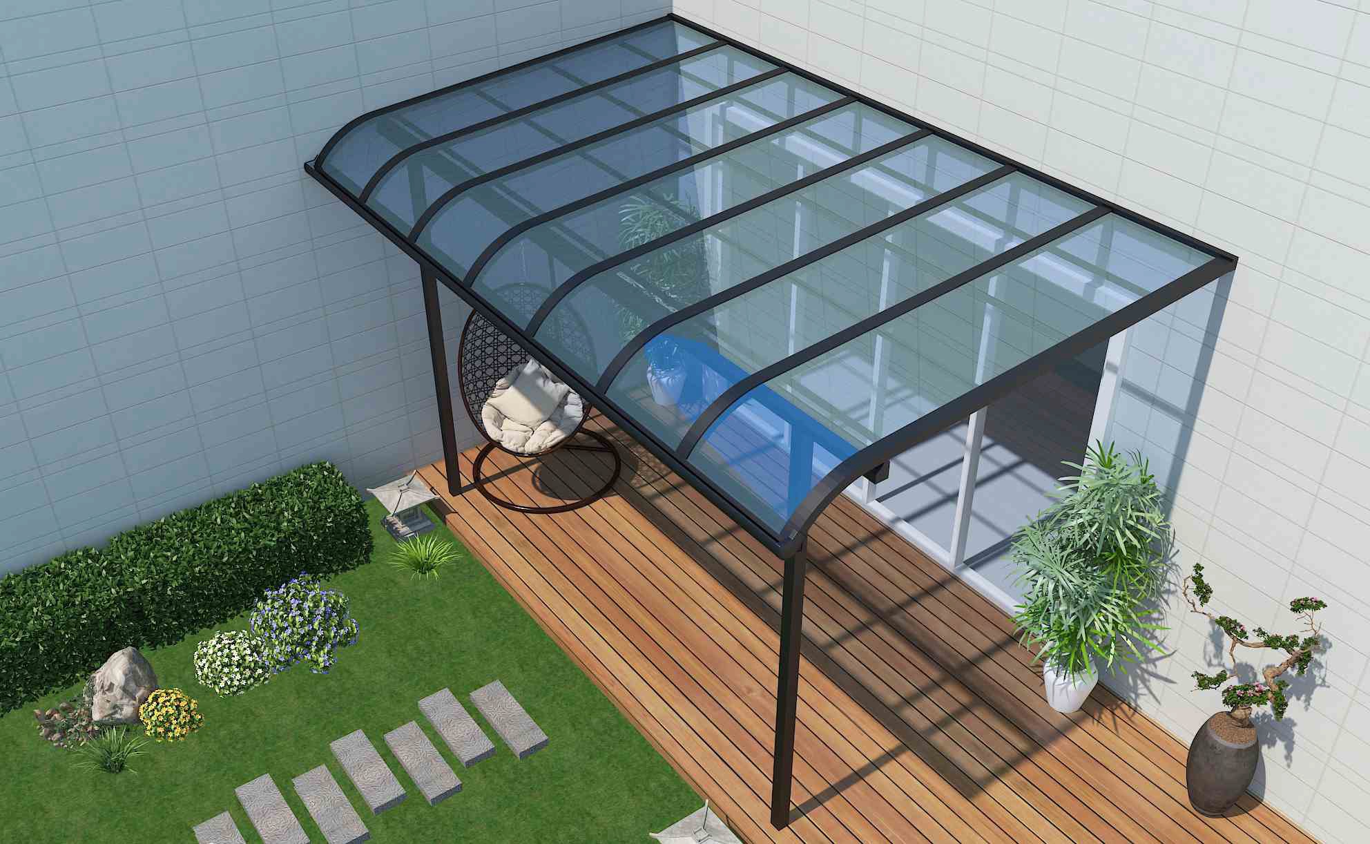A stand-alone structure that can be positioned anywhere — beside your driveway, deck, or pool.